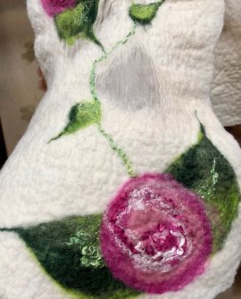 This beautiful felted scarf / wrap by Agnes Foss - featuring pink roses on a white background with organza inserts - was designed and handmade in New Zealand from pure New Zealand merino wool. The scarf is 27cm wide (at the widest point) and 150cm long. These measurements are approximate as the scarf is wavy-edged and very organic in its shaping.