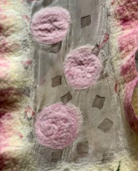 This beautiful felted scarf / wrap by Agnes Foss - featuring pink roses on a cream background with pink edging and an organza insert with felted dot detailing - was designed and handmade in New Zealand from pure New Zealand merino wool. The scarf is 27cm wide (at the widest point) and 160cm long. These measurements are approximate as the scarf is wavy-edged and very organic in its shaping.