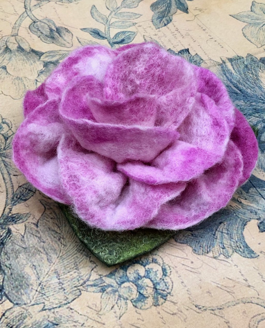 This beautiful brooch is made from felted pure New Zealand merino wool fashioned into the shape of a gorgeous full-blooming lavender-pink rose. The brooch is approximately 12cm in diameter