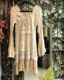 A gorgeously unique vintage-style cotton lace dress designed by Magriet Wagenaar of Gado Gado. This lovely dress - with its drawstring neckline and its long ruffled sleeves - is lavishly embellished with embroidery, pintucks, lace and ruffles evoking all the romance and femininity of an earlier era. You could wear this lovely piece alone, with bare legs and jandals for a beachy boho vibe, or you could wear it layered over a ruffled petticoat or skirt for a more full-on romantic look. You could also grunge it up with battered leather boots and a denim jacket or you could wear it simply with a pair of classic boots as Karina has done in our photographs. Any way you choose to wear it you can be sure you'll look fabulous. This lovely dress is labelled M for Medium and would fit sizes 10 to 12.