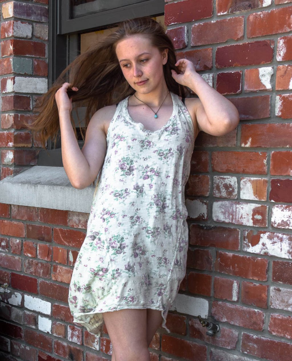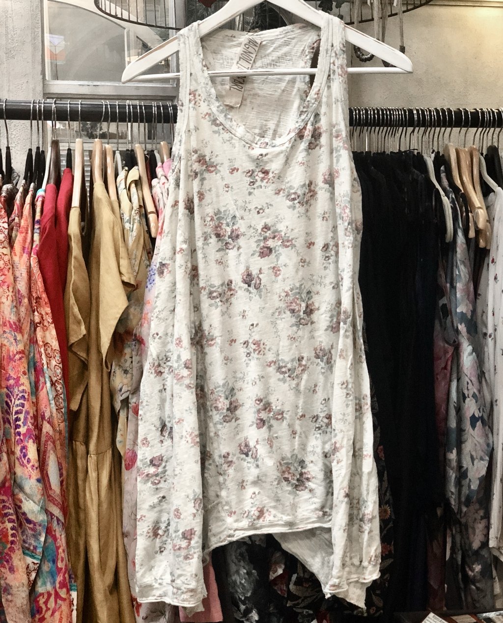 This gorgeous cotton-jersey tank in vintage floral print Wine Rose with its asymmetric hemline would look fabulous with jeans and a jacket in the cooler months or with shorts or bloomers and a pair of strappy boho-style sandals in the summer time.
