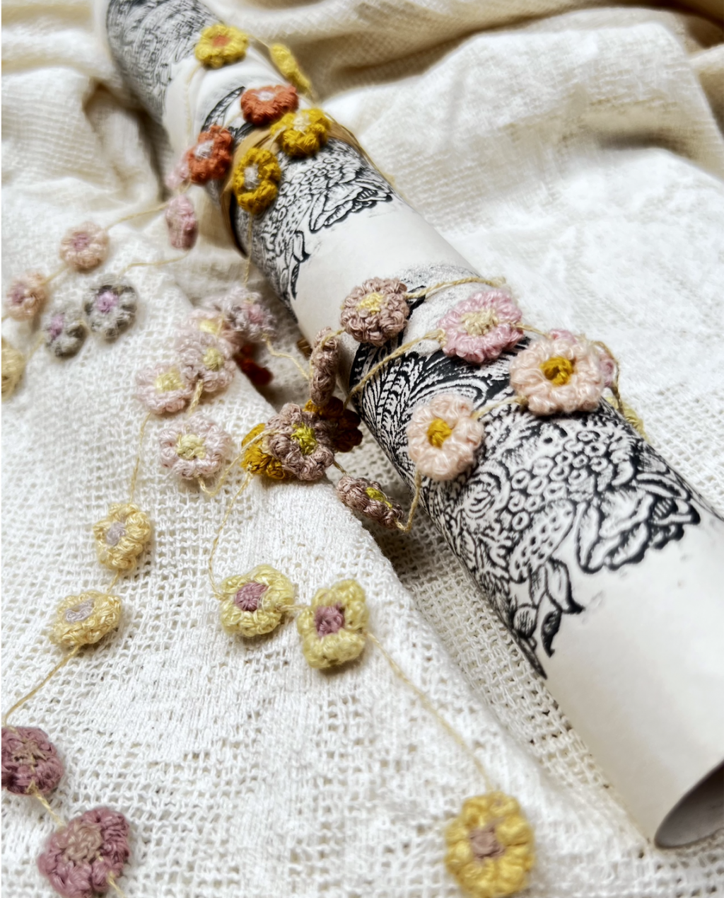A delightfully whimsical crochet daisy chain necklace in soft muted colours by Sophie Digard.