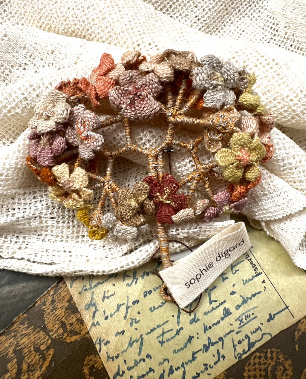 A beautiful hand-crafted flower wreath brooch in rustic colours by Parisian textile artist Sophie Digard.