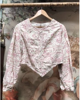 The European cotton hand-block print Luiza Jacket - in Durga - features antique hook, fading and distressing. Magnolia Pearl Clothing is ONE-SIZE-FITS-ALL