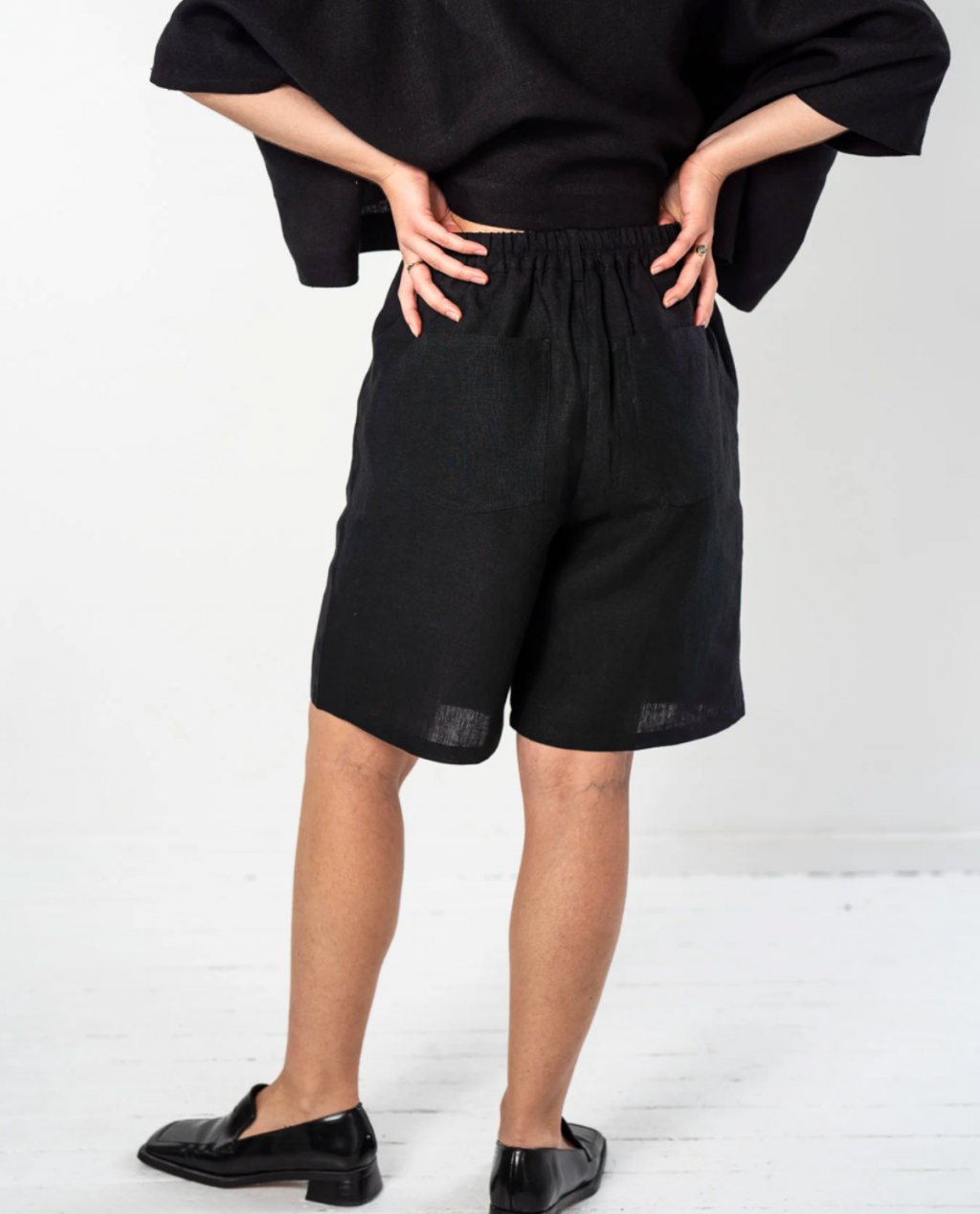 The Elsie Short from Eva's Sunday's Essentials Collection is a classic tailored short style.  Three quarters of the waistband is elasticated with the front section sitting flat with a zip and button. Two deep pockets are positioned on the front of the shorts with two patch pockets at the back.  These shorts hit just above the knee (on most).