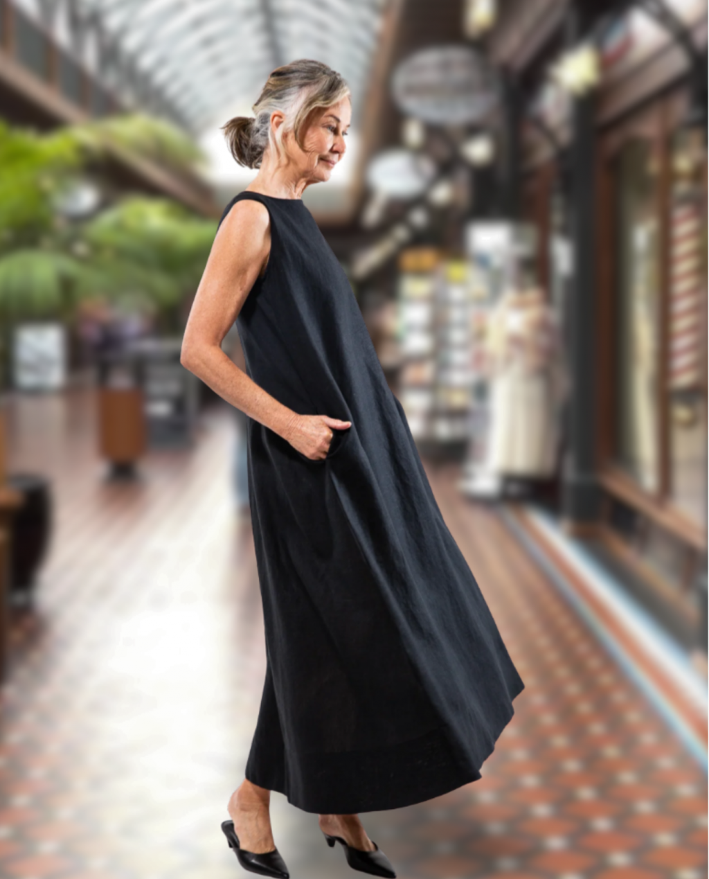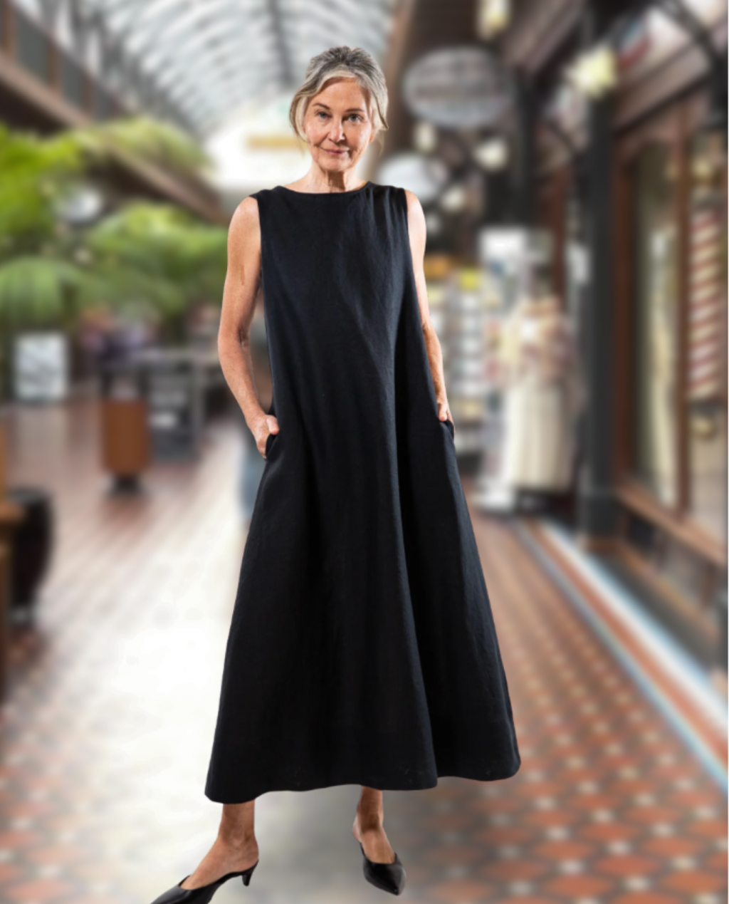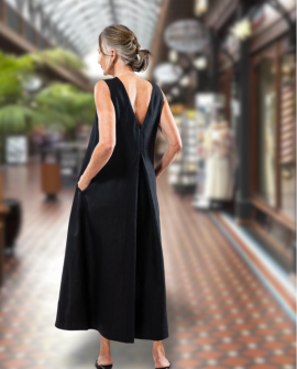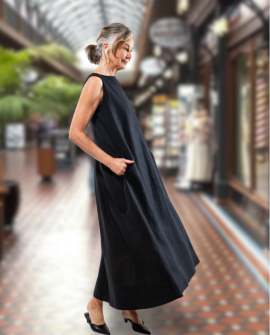 The Albert Dress in 100% (180gsm) linen - black - is reversible and offers two necklines - a high rounded and a v-neck. It features a deep inverted box pleat which opens at the waistline, pockets in the side seams and a simple rolled hem which means it can be easily shortened. The dress is wide cut over the shoulder, ensuring comfort and ample bra coverage. The dress is ankle-grazing on most people. The model is 179cm tall and wears a size XS.