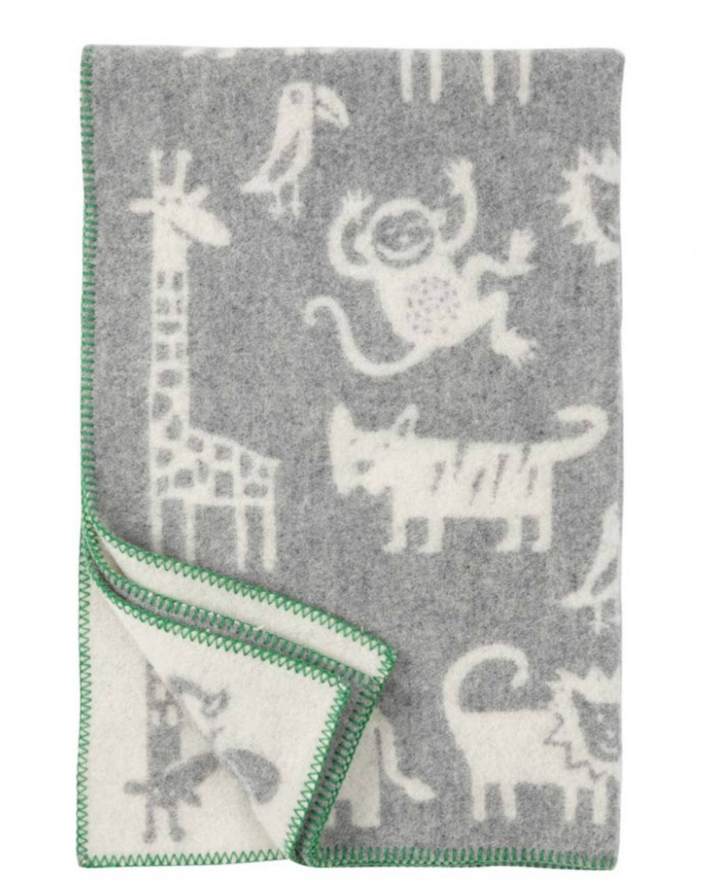 Keep baby warm in the winter months with this gorgeous grey 100% lambs wool blanket by Klippan featuring monkeys, giraffes, tigers and birds with contrasting green edge stitching . The definition of lambs wool is the first shearing of the sheep that is no older than six months. During later years we have also been able to produce throws in ecologic lambs wool. The ecologic lambs wool is totally free of pesticides and no chemicals or antibiotics have been used during the breeding of the sheep.