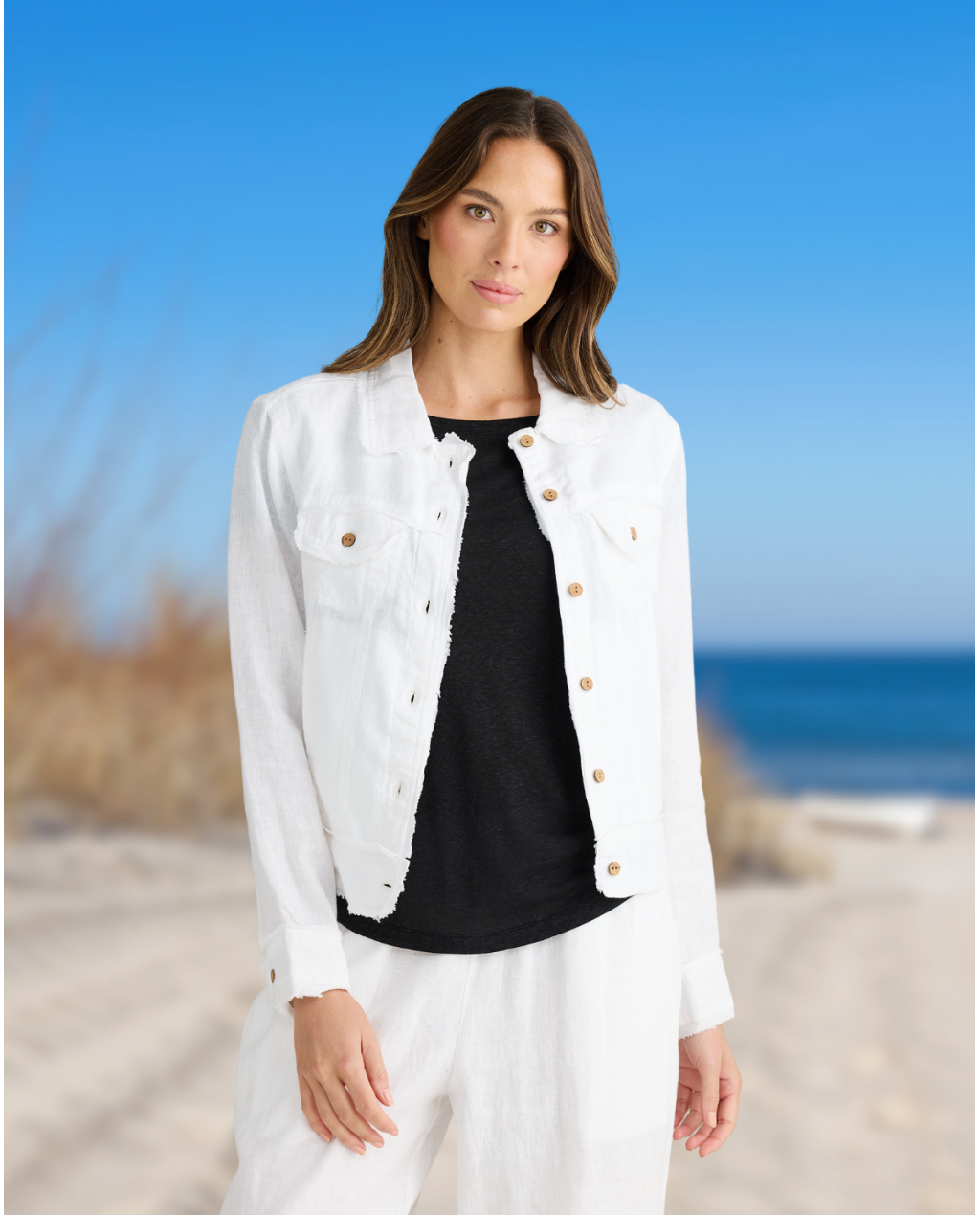 Finish your casual look with this structured boxy-style jacket by The Shanty Corporation, crafted from pure linen with a collar, front pockets, raw-edge hem detail and timber button-down front.
