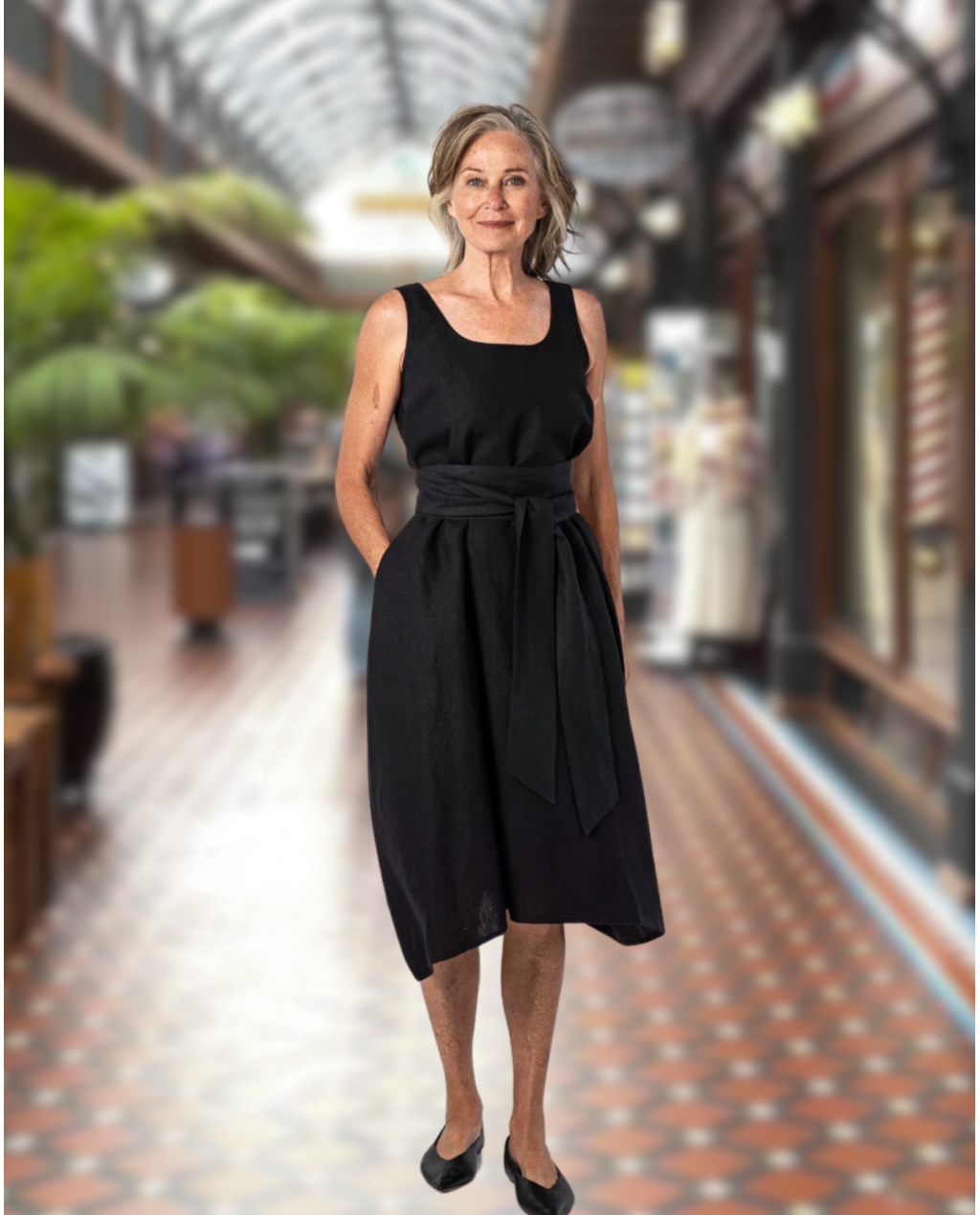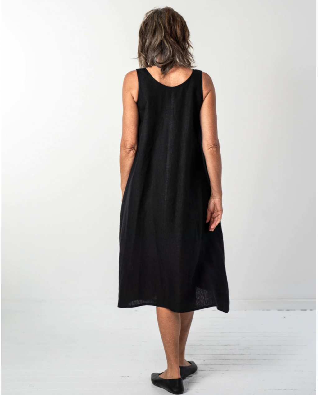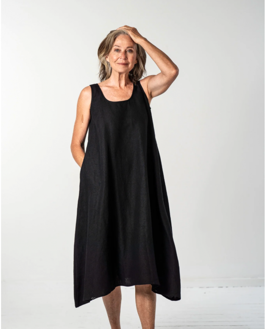 The Danni Slip Dress in black from Eva's Sunday's Essentials Collection is a simple A-line-shaped linen dress with narrow shoulders and a scooped neckline. Deep pockets are hidden in the side seams for added functionality. This midi-length dress will hit mid-calf on most people.
