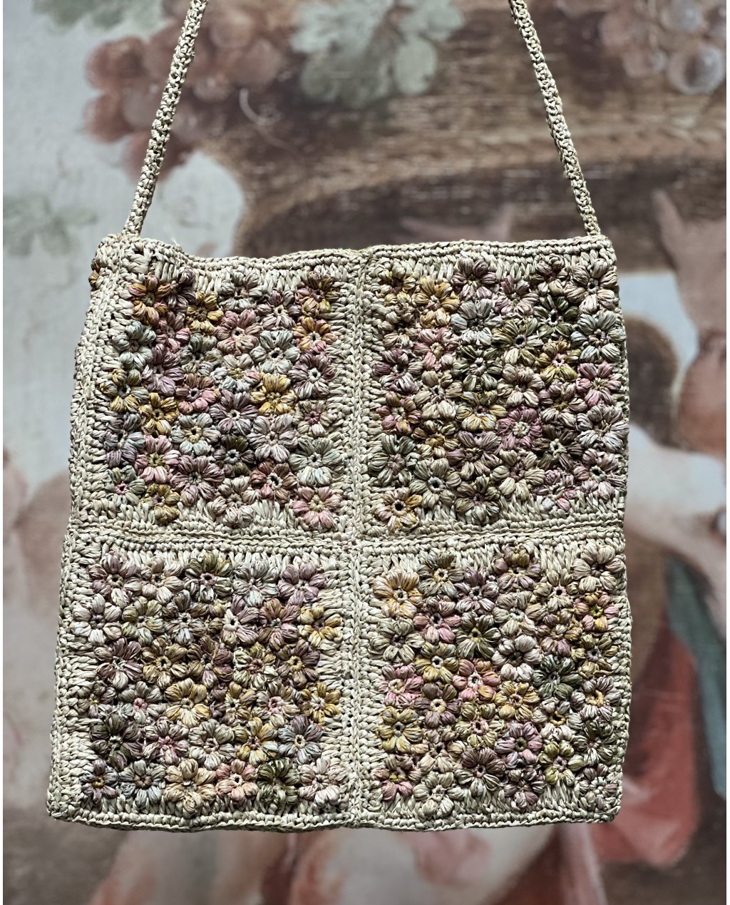 A beautiful hand-woven straw-coloured crocheted raffia shoulder bag in patchwork style with raffia flower detail and long over-the-shoulder strap by Sophie Digard.