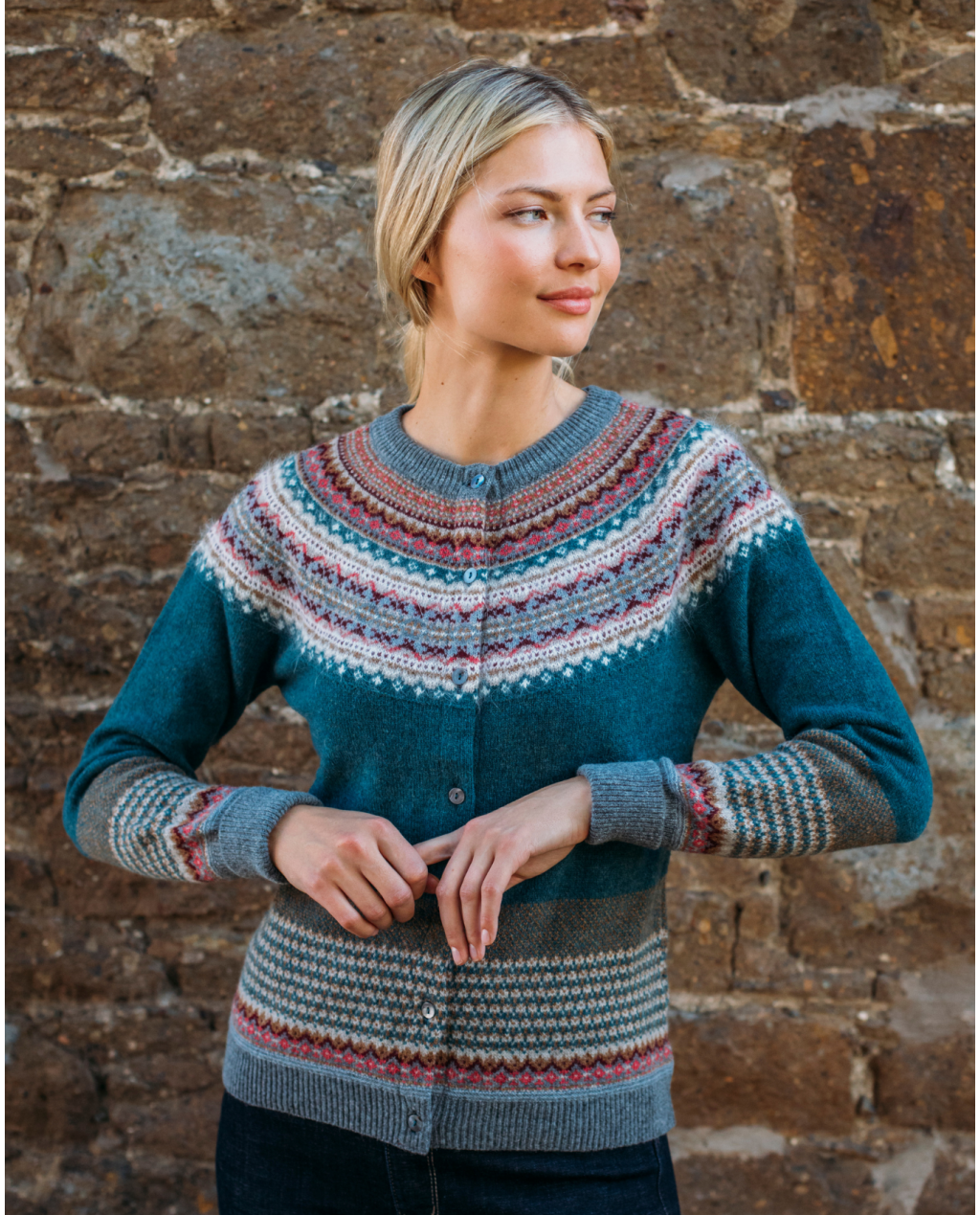 Featuring ERIBÉ's signature style with their iconic Fairisle patterned yoke this Merino Wool cardigan has a slightly shaped waist for a flattering fit and a touch of luxury angora in the yoke for added soft texture. Finished with mother of pearl buttons and cosy long turn-down cuffs to keep your hands warm in winter this cardigan is perfect for layering with dresses or with jeans to give you that stylish or casual vibe you're looking for.