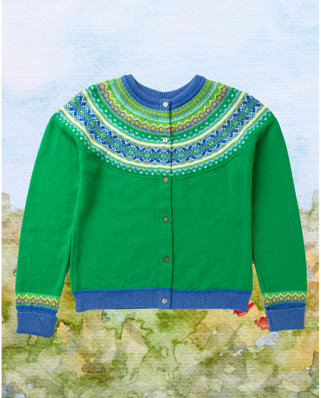 Featuring ERIBÉ's signature style with their iconic Fairisle patterned yoke this Merino Wool cardigan has a slightly shaped waist for a flattering fit and a touch of luxury angora in the yoke for added soft texture. Finished with mother of pearl buttons and cosy long turn-down cuffs to keep your hands warm in winter this cardigan is perfect for layering with dresses or with jeans to give you that stylish or casual vibe you're looking for.
