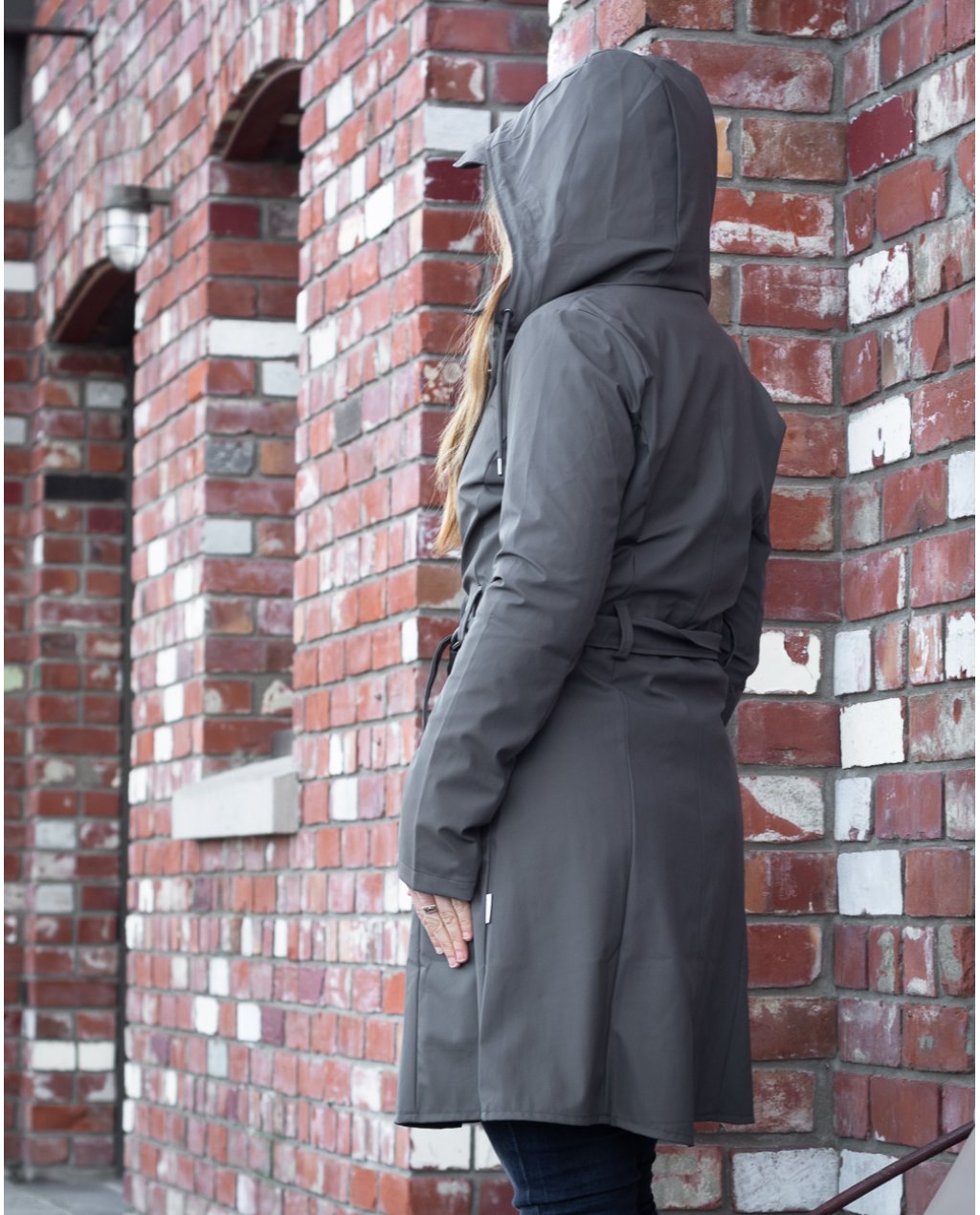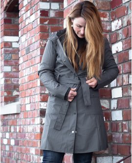 The Curve Jacket by Danish company Rains is a classic yet practical women’s rain jacket inspired by the timeless Trench Coat. With a slightly A-shaped fit and tie belt at the waist, the Curve Jacket emphasizes the female silhouette. Made from a water-resistant lightweight fabric with a matte finish, this raincoat features a front placket with snap buttons, a waterproof zipper, two outside front pockets with stainless steel buttons, two ventilated eyelets under each armpit, ultrasonically welded seams, an adjustable hood and cuffs and a fishtail. This jacket also comes in Taupe and Rock.