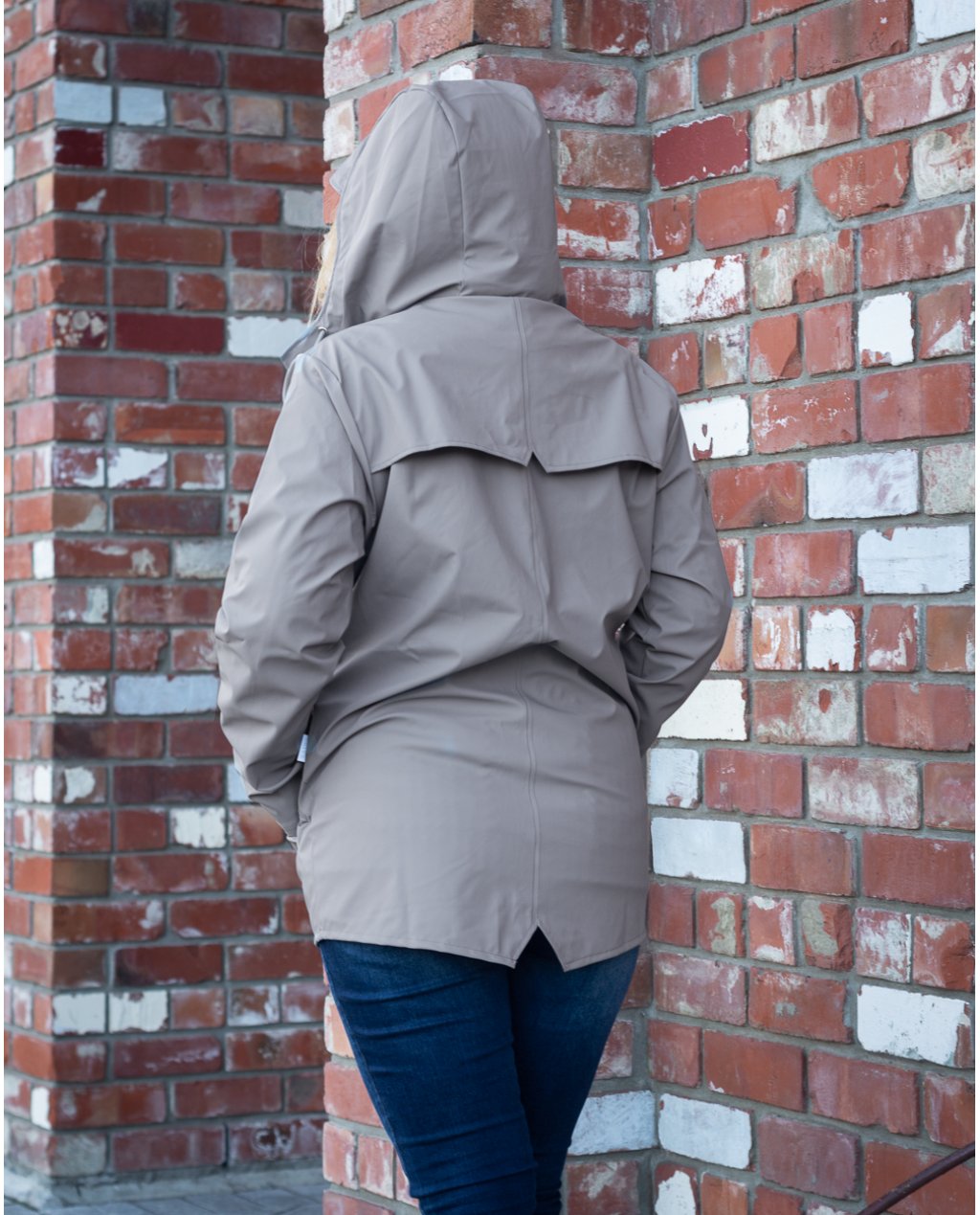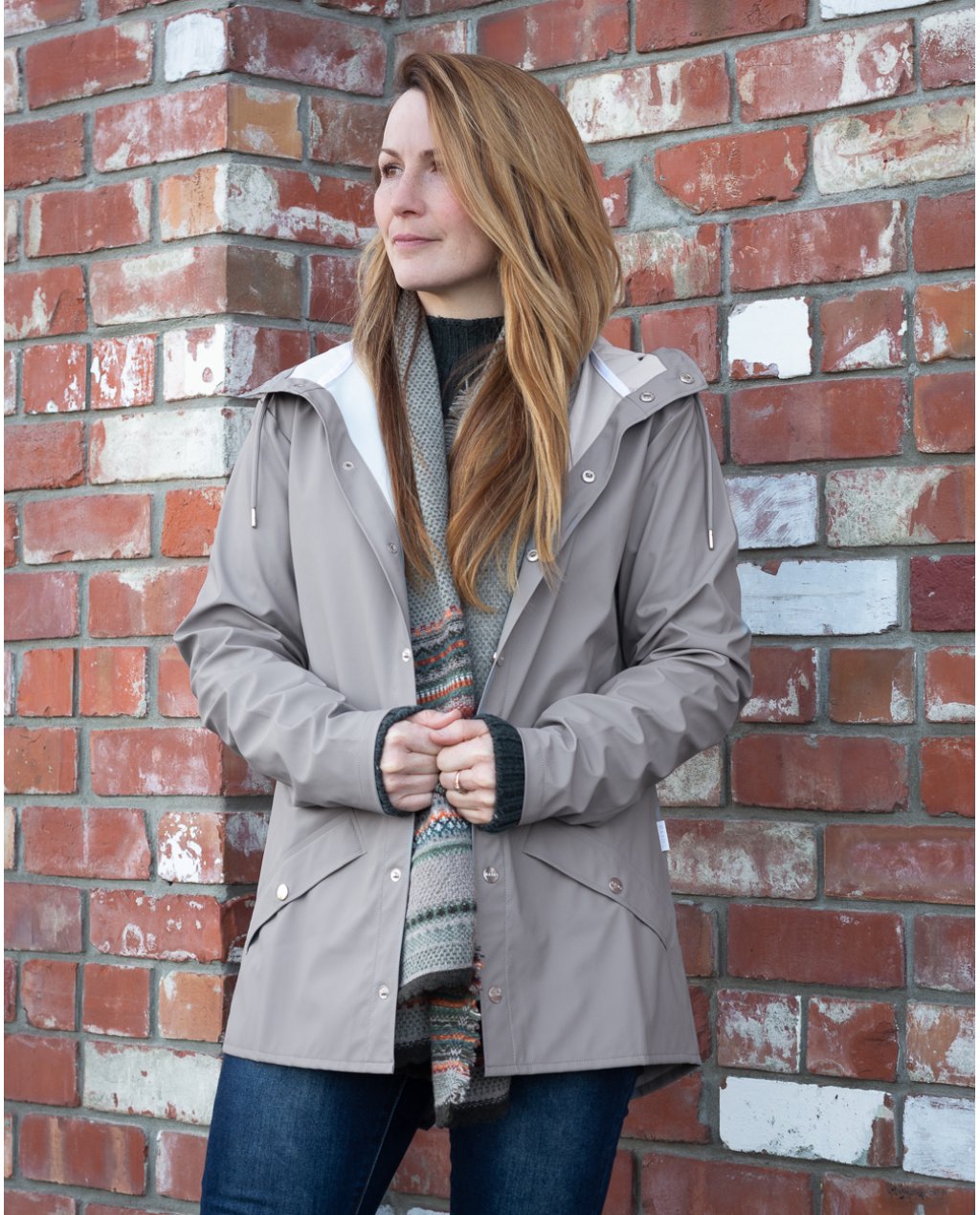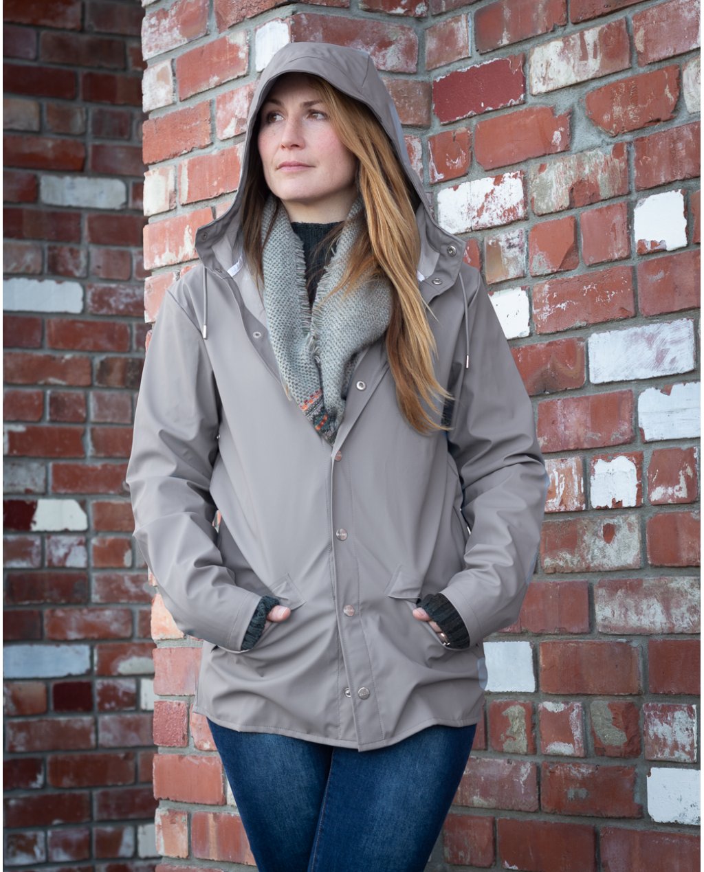 The 'Jacket' is functional and casual with a contemporary unisex rain jacket silhouette. It’s a basic style - an urban version of a conventional jacket - with classic rainwear details such as the storm shield and snap buttons at the sleeve hem. The jacket also features double-welded slanting pocket flaps, a French front placket with snap buttons, adjustable hood and cuffs and ultrasonically welded seams to keep you warm and dry no matter how hard the rain is pelting down. The fabric is lightweight with a matte surface and a soft hand feel, very pliant so it’s easy and comfortable to wear. This Rains Jacket is in a mid-grey colour Rains calls 'Rock'
