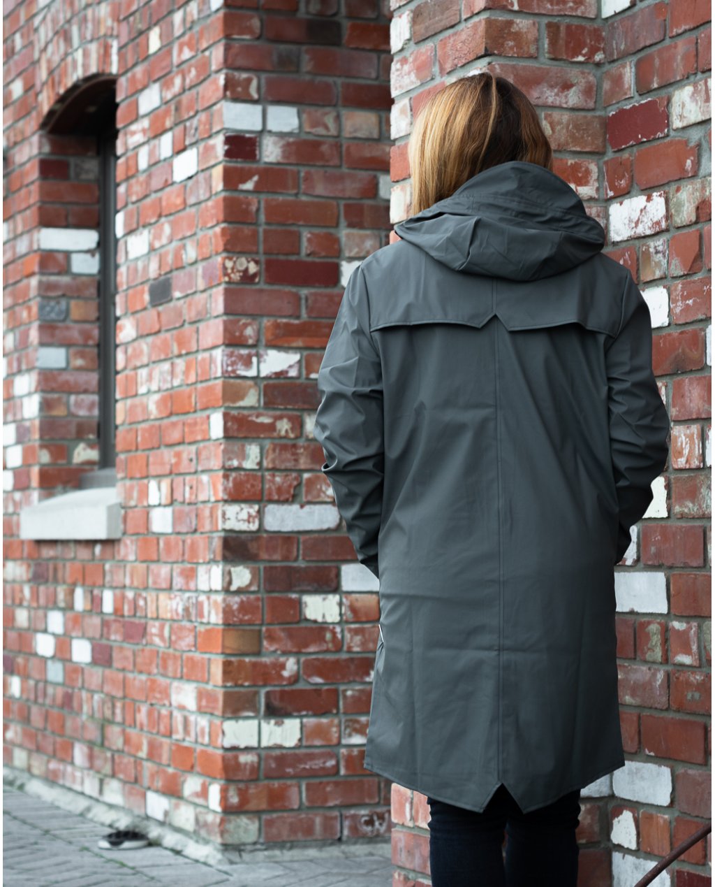 The Rains ‘Long Jacket’ is a longer version of the urban Jacket and both are essential Rains classics. Made from a water-resistant lightweight fabric with a matte finish, this casual unisex rain jacket has an elegant appearance. Designed in a casual raincoat silhouette, it has double welded slanting pocket flaps, a front placket with snap buttons, adjustable hood and cuffs, ventilation under the storm shield, a fish tail and ultrasonically welded seams to keep you dry no matter how the rain pelts down.  This jacket is in a dark, dark grey called 'Slate'. The Long Jacket is also available in Faded Blue, Off-White, Rock, Taupe, Olive, Ice and Blush.