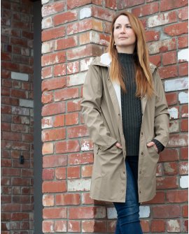 The Rains ‘Long Jacket’ is a longer version of the urban Jacket and both are essential Rains classics. Made from a water-resistant lightweight fabric with a matte finish, this casual unisex rain jacket has an elegant appearance. Designed in a casual raincoat silhouette, it has double welded slanting pocket flaps, a front placket with snap buttons, adjustable hood and cuffs, ventilation under the storm shield, a fish tail and ultrasonically welded seams to keep you dry no matter how the rain pelts down.  This jacket is in a soft tan called 'Taupe'. The Long Jacket is also available in Faded Blue, Off-White, Rock, Olive, Slate, Ice and Blush.