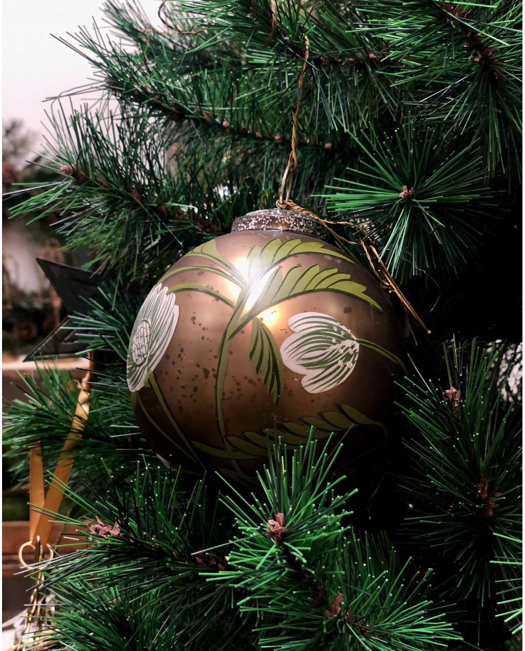 An exquisite gold glass ball decorated with painted roses by WALTHER & CO -  a Danish interior company that specialises in consciously handmade designs inspired by nature and Nordic traditions. From delicate mouth blown glass balls to golden braided brass to rustic zinc houses Walther & Co decorations will add a touch of special magic to your Christmas.