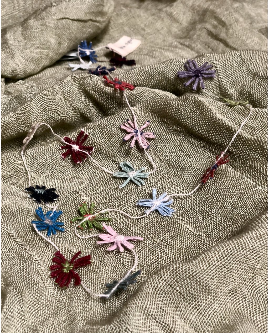 Sophie sources the finest natural materials - predominately single ply Australian merino wool spun in Italy and fine Belgian linen – which are then hand-dyed in France, using vegetable-based dyes, and shipped to Madagascar where Sophie employs local women to crochet and embroider these beautiful fibres into the works of textile art they eventually become. Digard works to fair trade principles and her workshops provide a valuable source of income to her employees whilst nourishing traditional textile skills. Sophie Digard scarves, necklaces, brooches and bags can comprise of up 60 different shades - the beautifully coloured threads plied together and then crocheted into gorgeous creations, each one with its own subtle variation of tone, each one utterly unique.